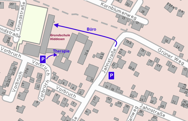 Unsere Räume sind in der Grundschule Hiddesen, Jahnstr. 15a untergebracht. Das Büro ist im Hauptgebäude, 1. OG links, Zimmer 14. Die Therapieräume finden Sie im Erdgeschoss des Nebengebäudes am Vorbruch.